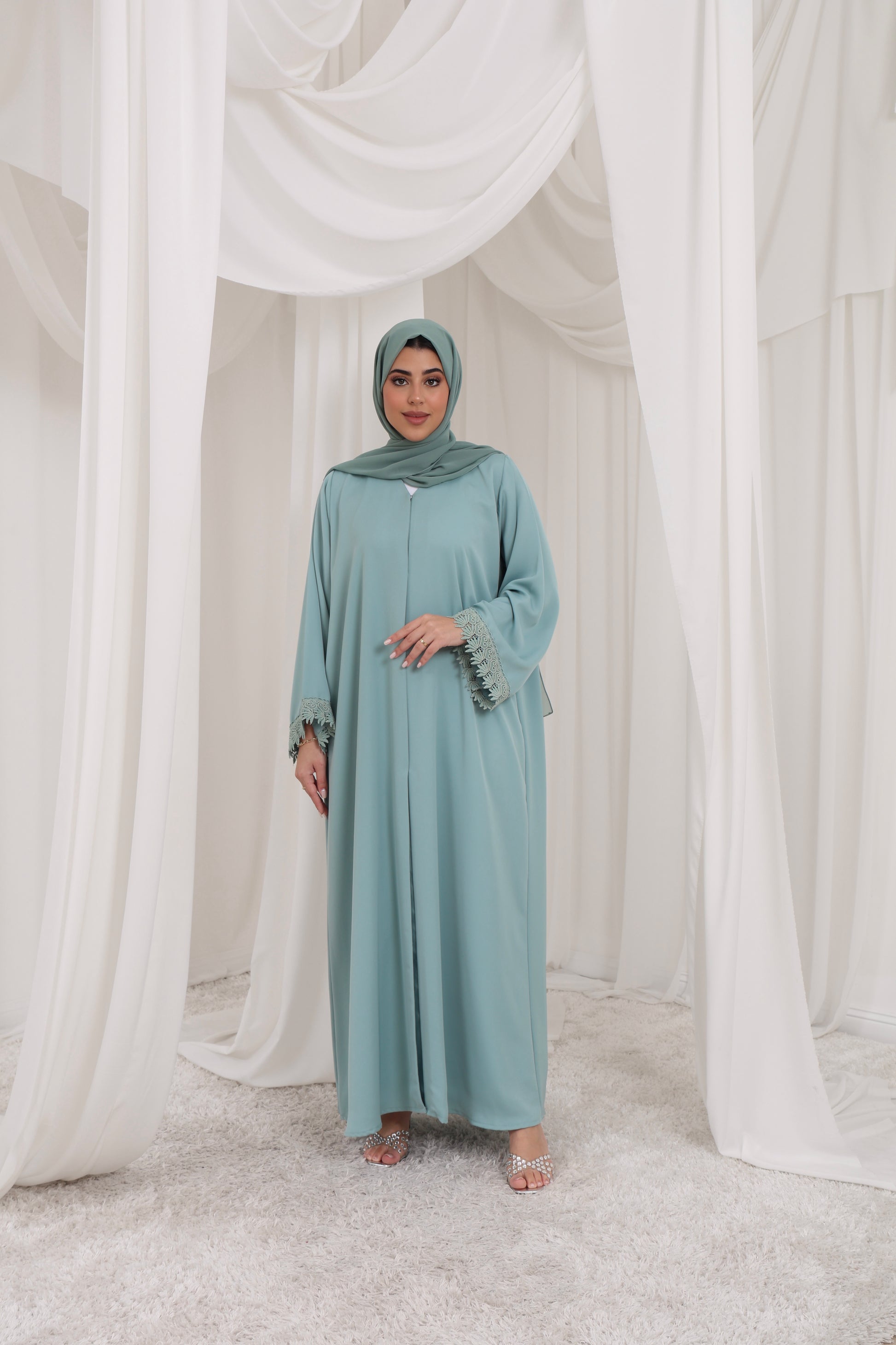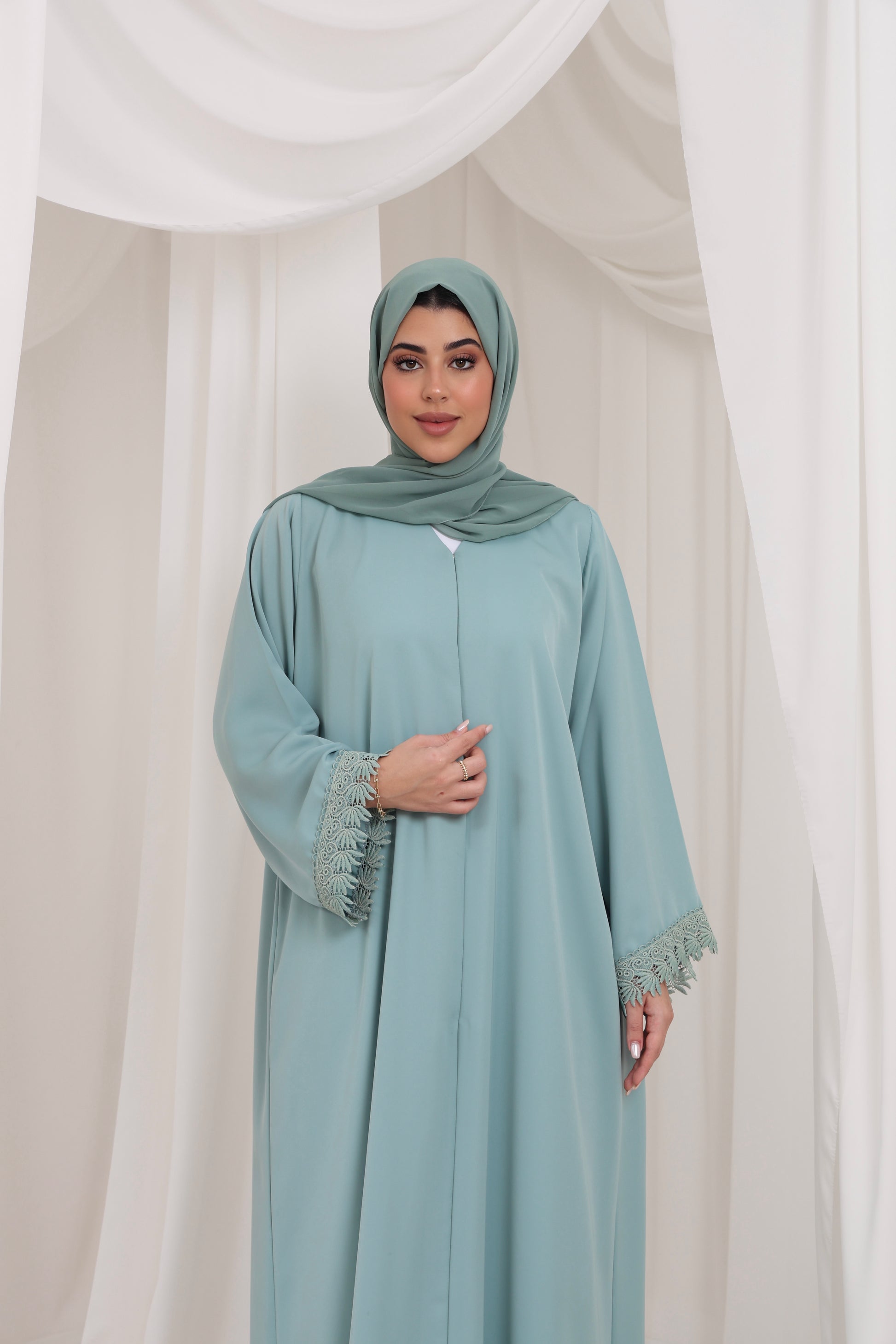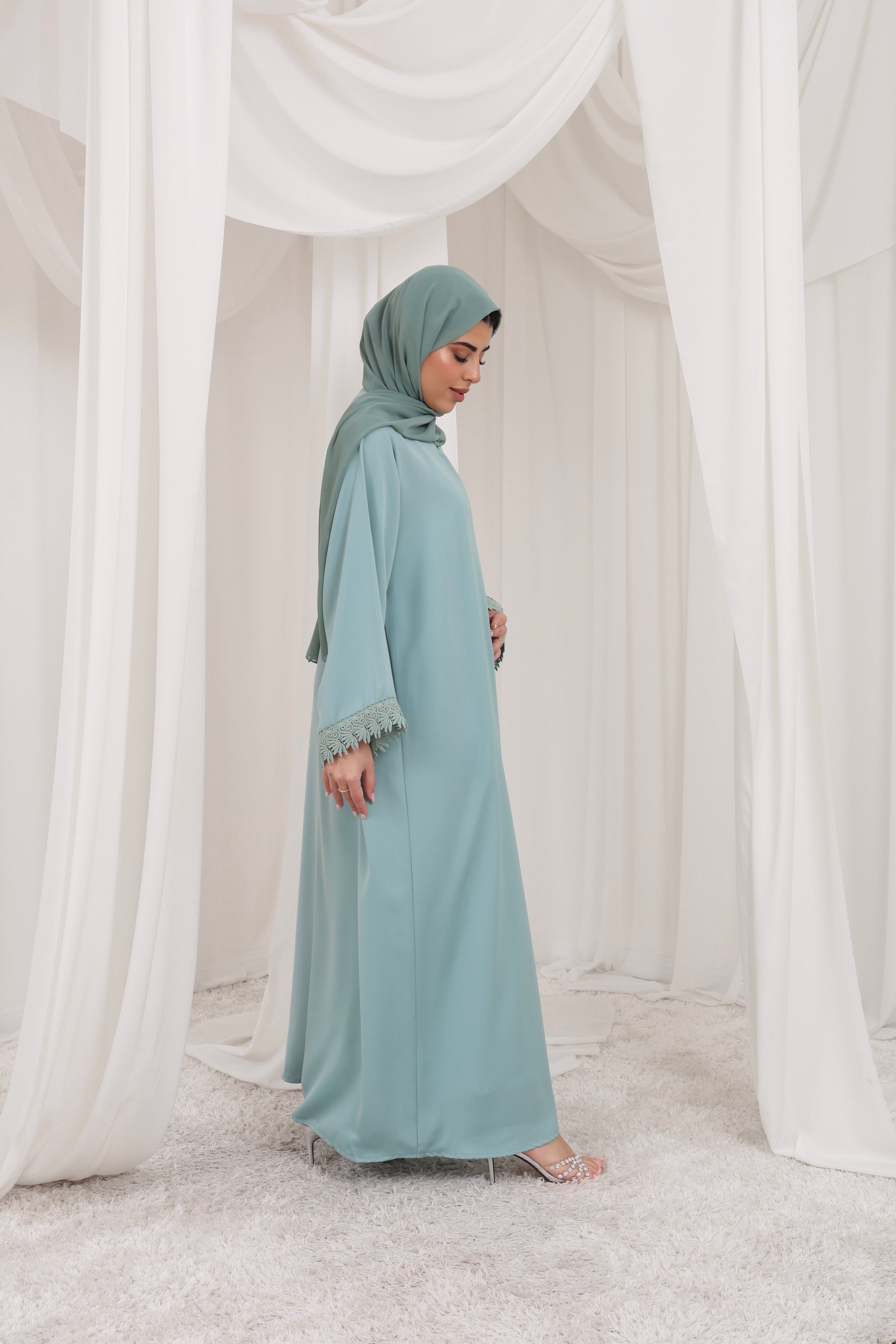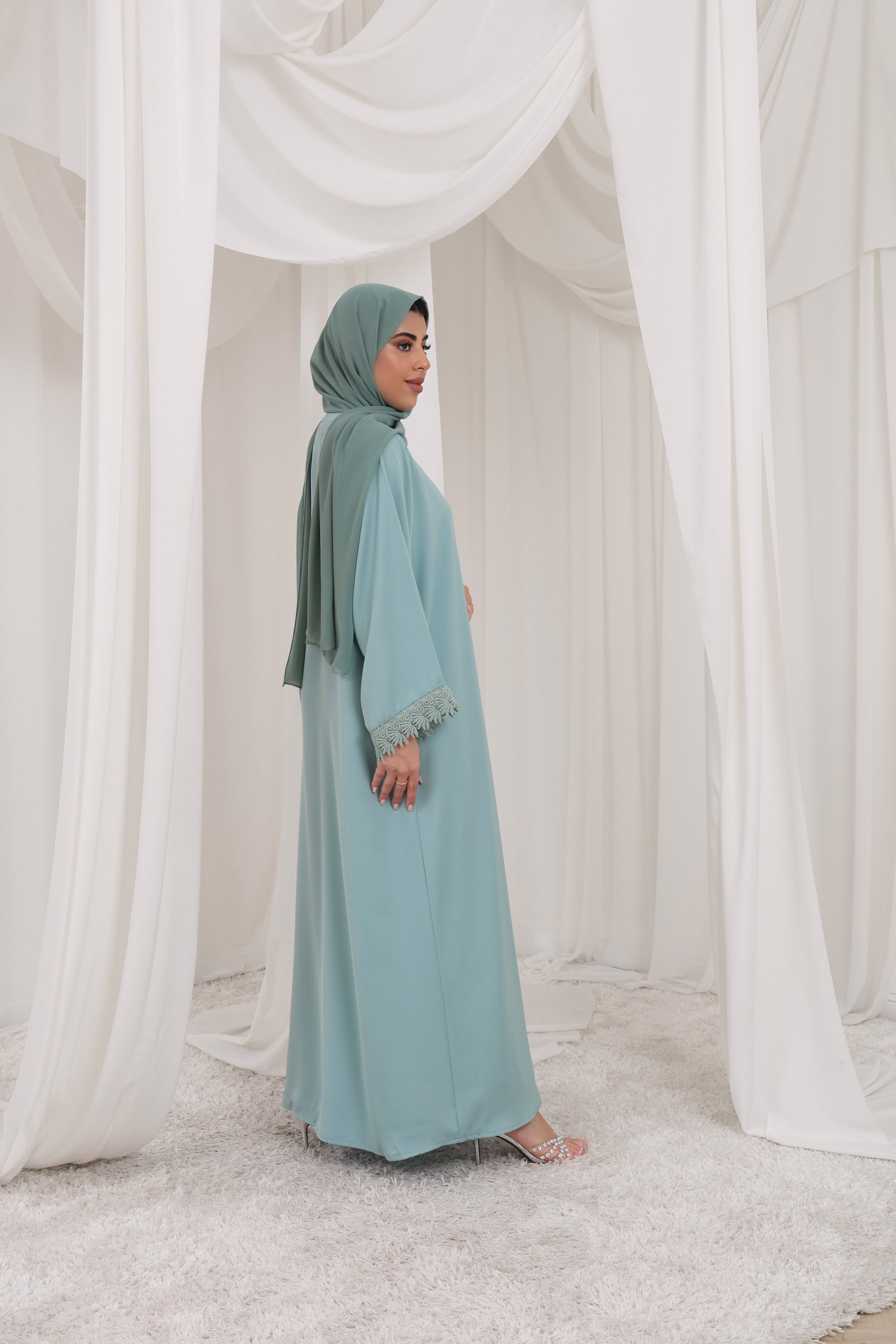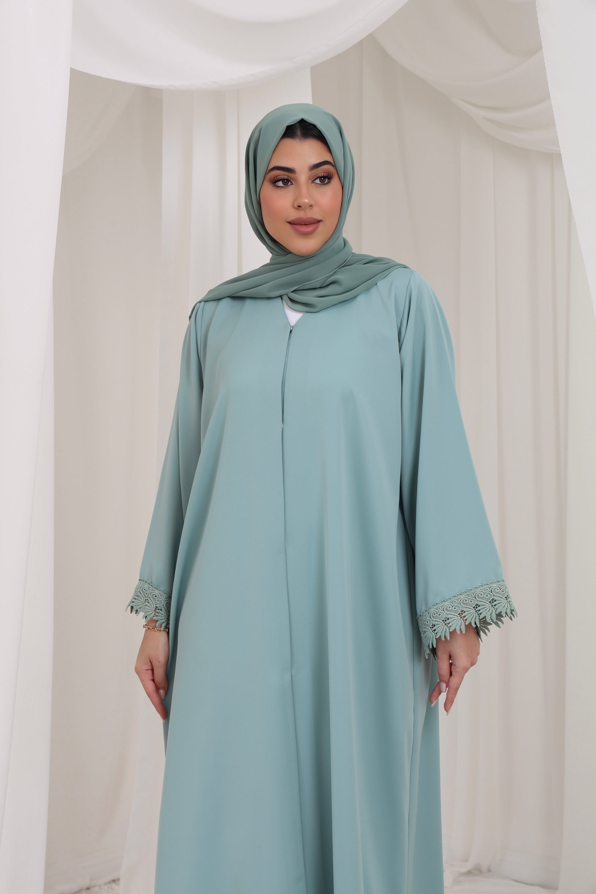 Elegante Abaya mit feinen Spitzen-Details. Blickdichtes, fliessendes Material. Inklusive passendem Kopftuch perfekt für festliche Anlässe oder den Alltag.