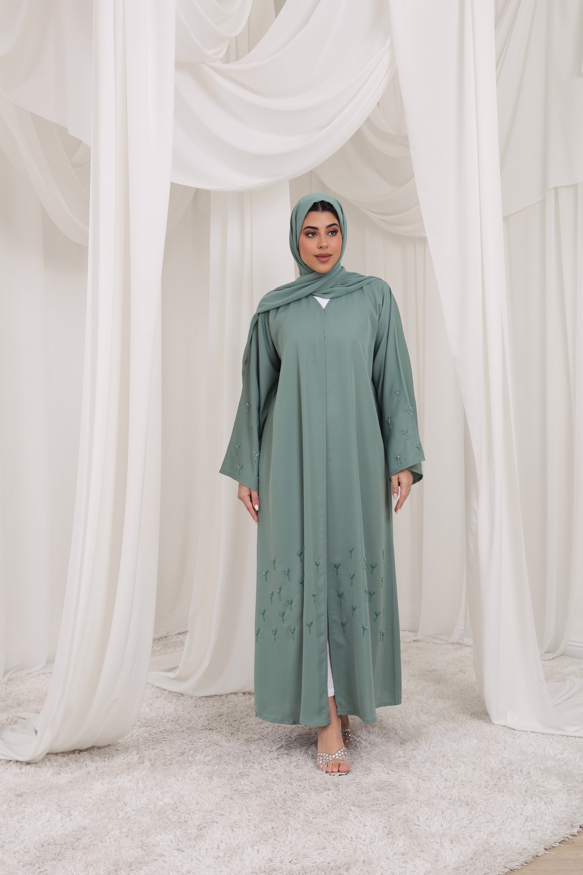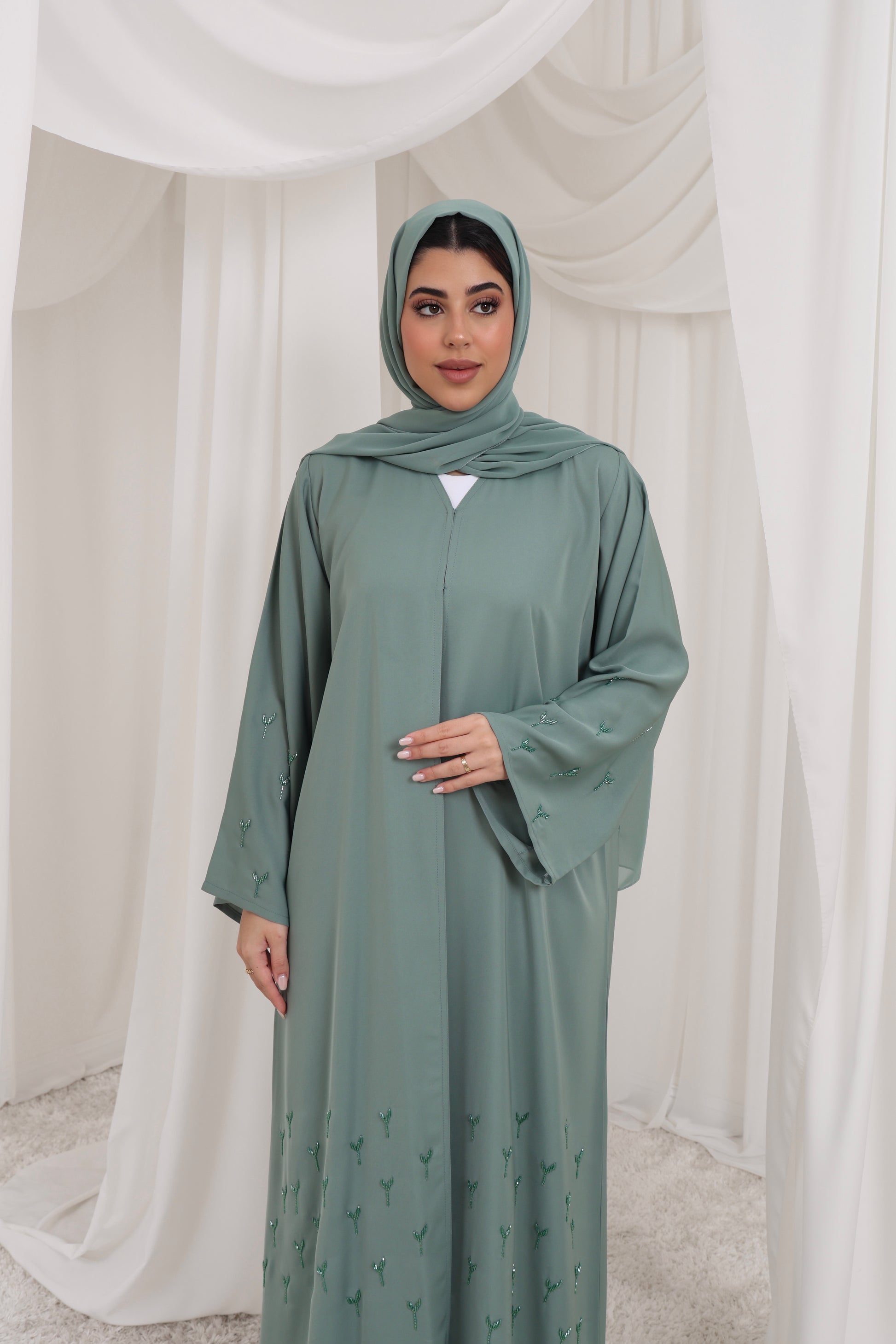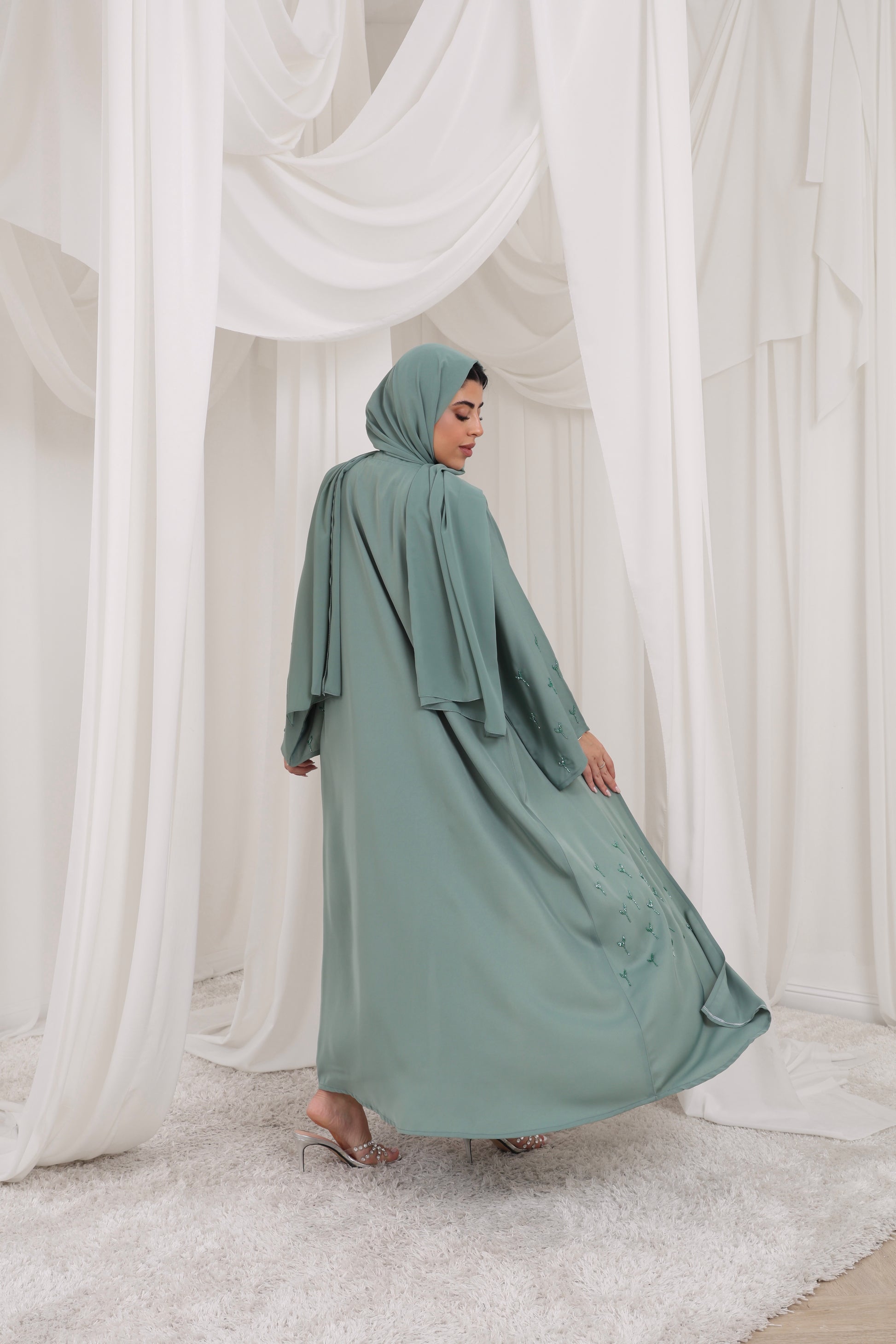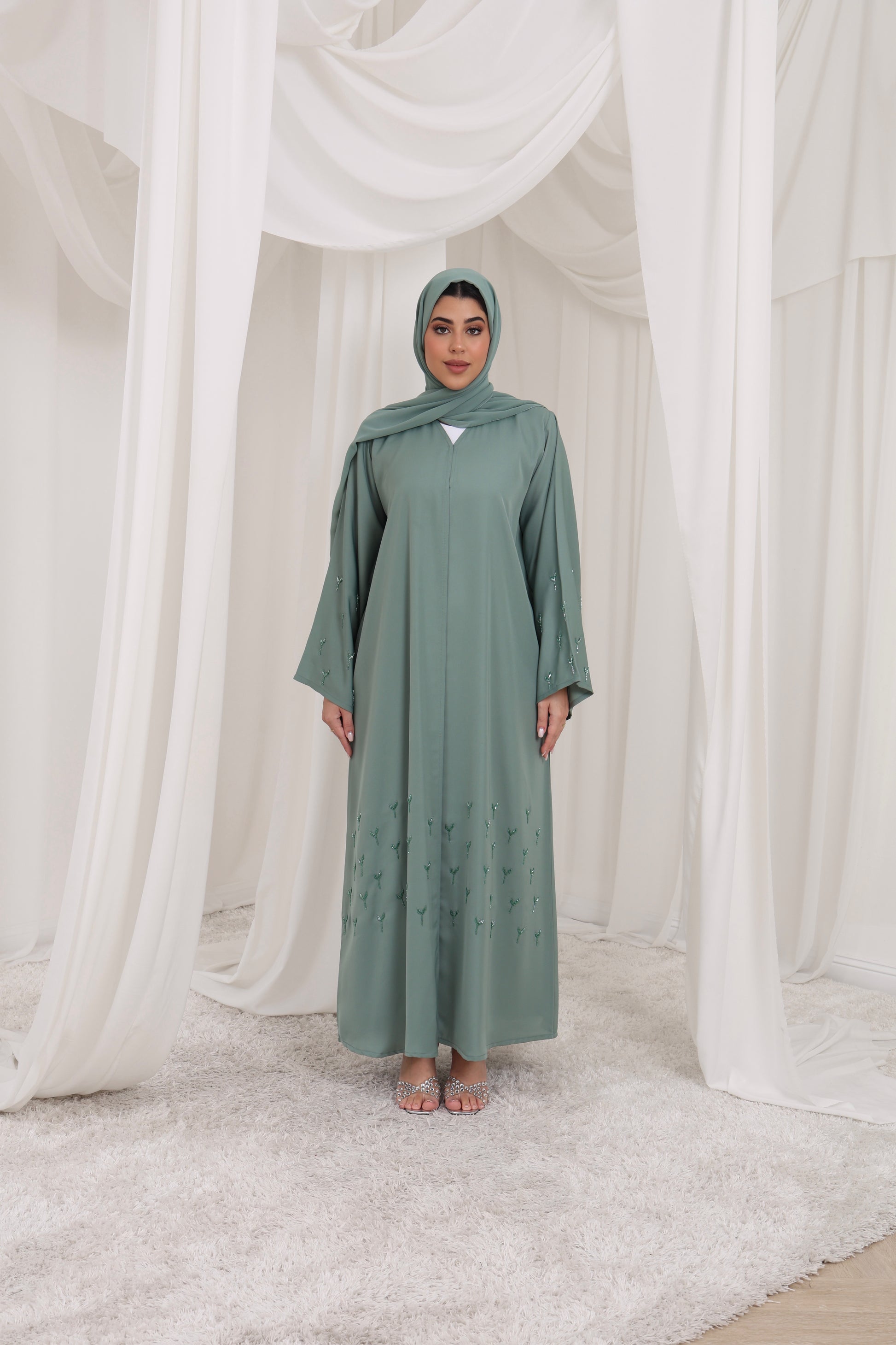 Elegante smaragdgrüne Abaya mit feinen Glitzersteinen am Saum. Leichtes, blickdichtes Material. Inklusive passendem Kopftuch. Ideal für festliche Anlässe.